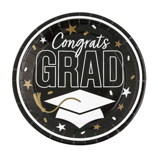 Celebrate your graduate in style with these 9" Graduation Party “Congrats Grad” Round Paper Dinner Plates. With a bold design featuring a black graduation cap and the phrase “Congrats Grad,” these vibrant plates add the perfect touch of school spirit and charm to your party tableware. Available in a variety of colors to match your school theme, these disposable plates make setup festive and cleanup effortless.