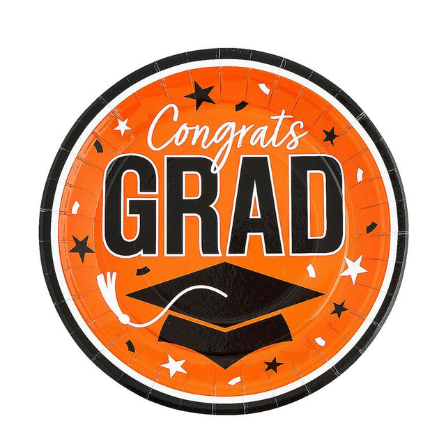 Celebrate your graduate with these stylish 9-inch Gold Congrats Grad Paper Dinner Plates! Featuring a vibrant background, bold "Congrats Grad" lettering, and a graduation cap design, these plates are perfect for adding a festive touch to your graduation party table. Available in a variety of bright colors, they complement school spirit and other party decorations. These disposable plates make cleanup a breeze, so you can focus on celebrating the big day.